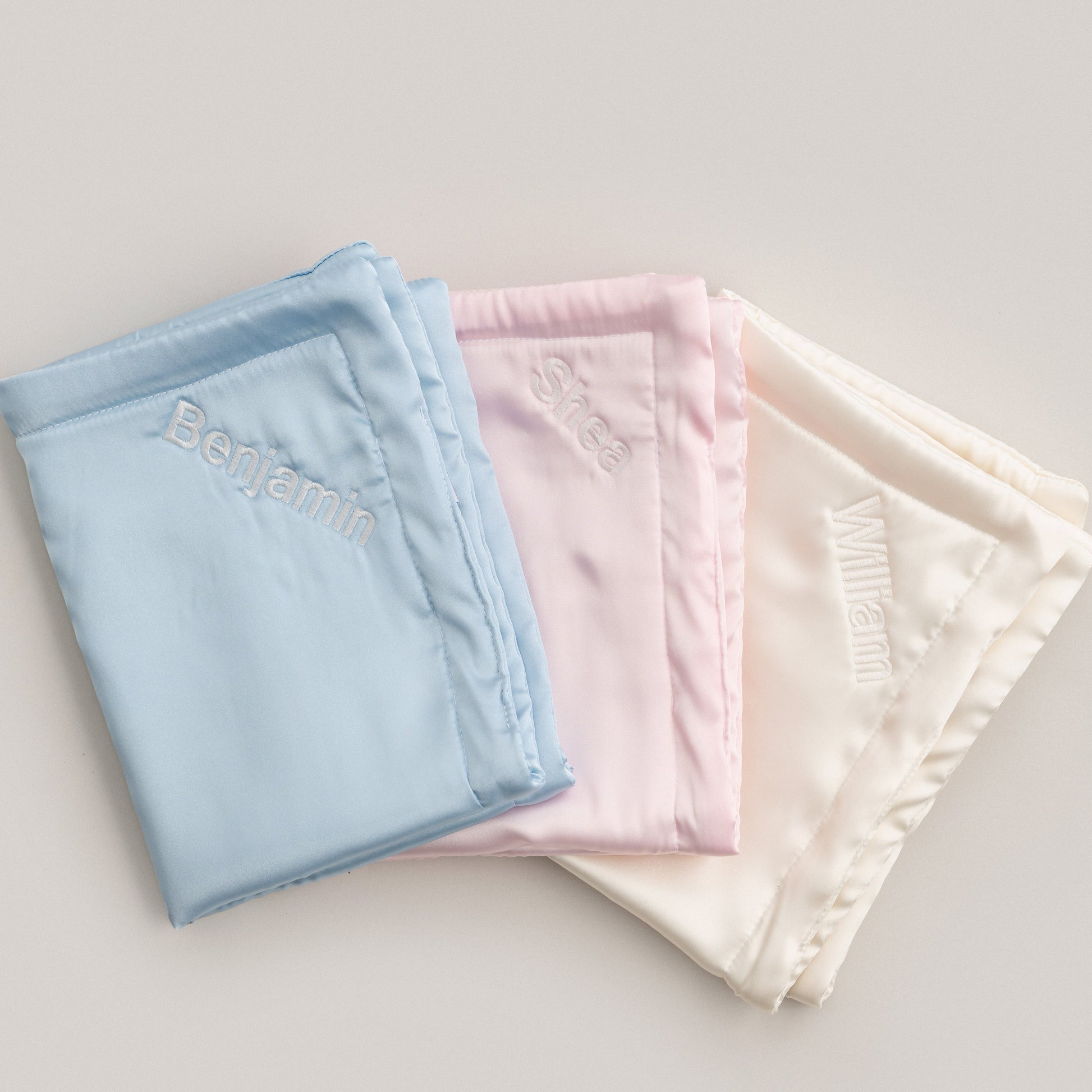 Our All Silkie Security Blanket is made for tiny hands and big snuggles. Crafted with charmeuse satin on both sides, it offers the perfect mix of silky smoothness and cozy warmth. Its small size makes it easy for little ones to carry everywhere - from stroller rides to naptime cuddles. American made. Our customized and personalized blankets are a perfect gift for babies!